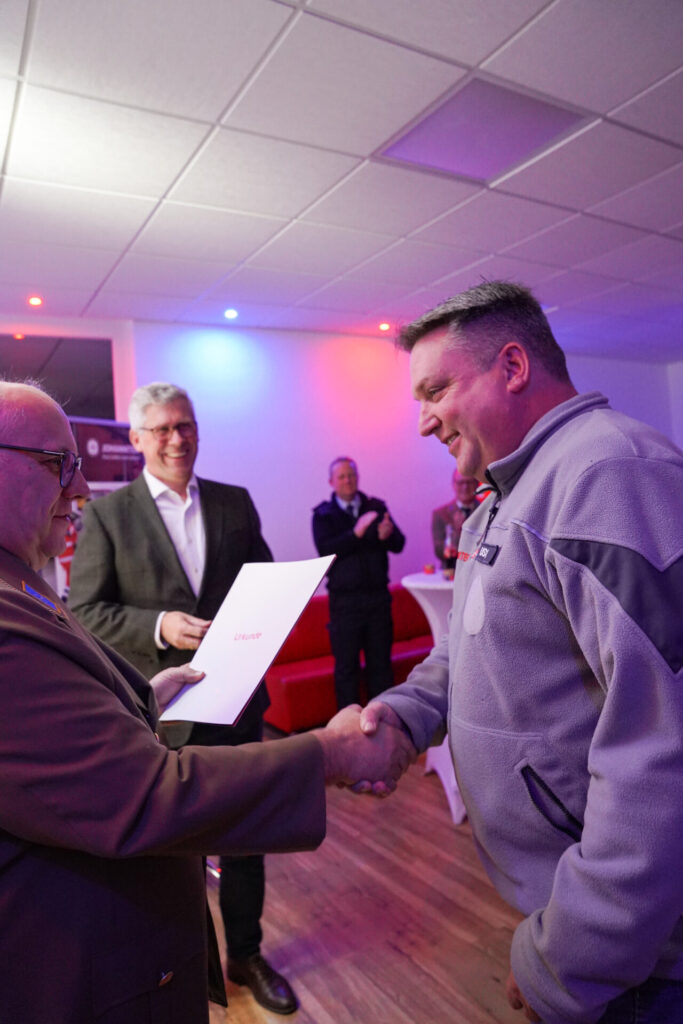 Er verwies zudem auf die Lehren aus dem Einsatz: Die Stadt hatte im Nachgang eine Sandsack-Füllmaschine angeschafft, die Kläranlage wird baulich verstärkt, und eine Hochwasserpartnerschaft für die mittlere und untere Leine wurde gegründet, um künftig gemeinsam mit Anrainern und Verbänden Konzepte für das gesamte Flussgebiet zu entwickeln. „Neben technischen Verbesserungen bleibt der Einsatz motivierter Menschen entscheidend“, so Piellusch. Abschließend sprach er seinen persönlichen Dank aus und übergab gemeinsam mit Silbermann die Hochwasser-Ehrennadeln und Urkunden an die Helfer.