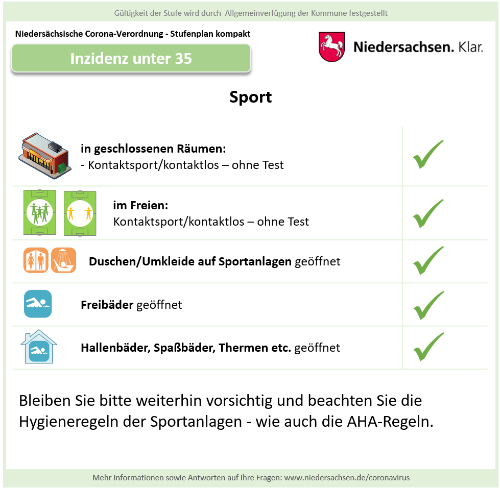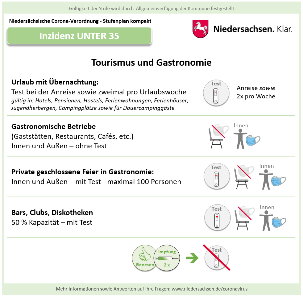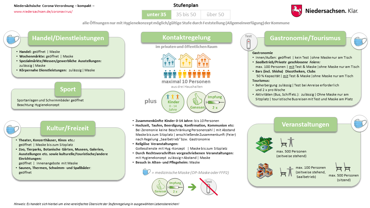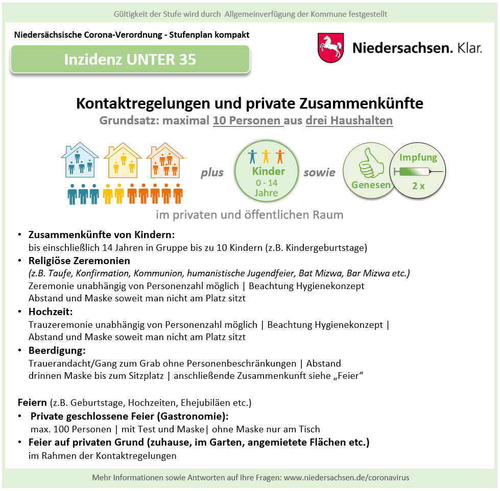 Hier die Grafiken des Landes Niedersachsen zur vereinfachten Darstellung der Corona-Regeln bei einer Inzidenz 10-35, für Details klicken Sie bitte hier Verfügung Region Hannover