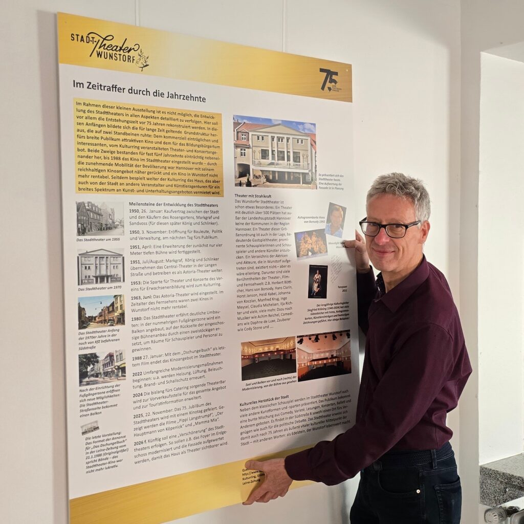 Am Samstag, den 22. November verwandelt sich das Stadttheater Wunstorf für einen Tag in ein lebendiges Film- und Festhaus. Der Kinotag zur Jubiläumsfeier bietet ein abwechslungsreiches Programm, das sowohl Filmfans als auch Musikliebhaber anspricht. Die Vorbereitungen für die Feierlichkeiten sind bereits in vollem Gange. Stadtarchivar Klaus Fesche hat die ersten Tafeln einer Ausstellung über die Geschichte des Stadttheaters angebracht. Diese Ausstellung, die mit interessanten Fotos aus dem Stadtarchiv illustriert ist, erzählt den Werdegang des Wunstorfer Stadttheaters vom Bau bis heute.