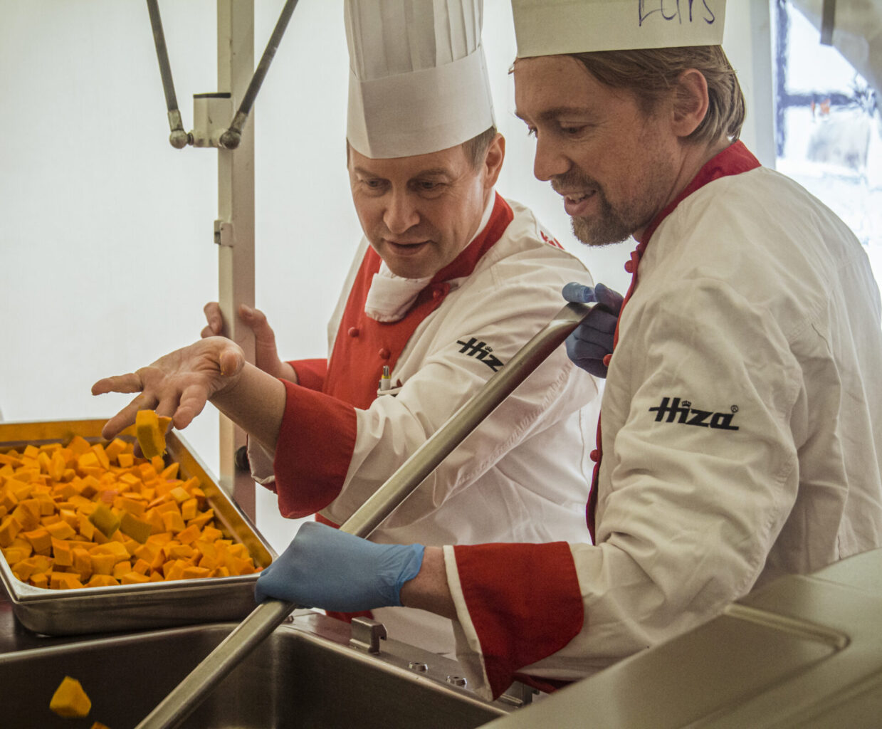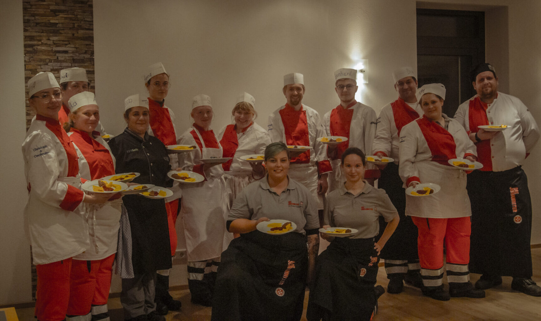 Am Folgetag erfolgte nach einem theoretischen Unterrichtsblock, bei dem unter anderem Hygiene, Berufsbekleidung, Qualitätsanforderungen, Warenkunde, Schnitttechniken und Unfallverhütung auf dem Plan standen, der Einsatzbefehl an die Gruppe: Wählt den Küchenchef, teilt die Posten ein und stellt aus dem vorhandenen Warenkorb ein Drei-Gänge-Menü für 25 geladene Gäste her.